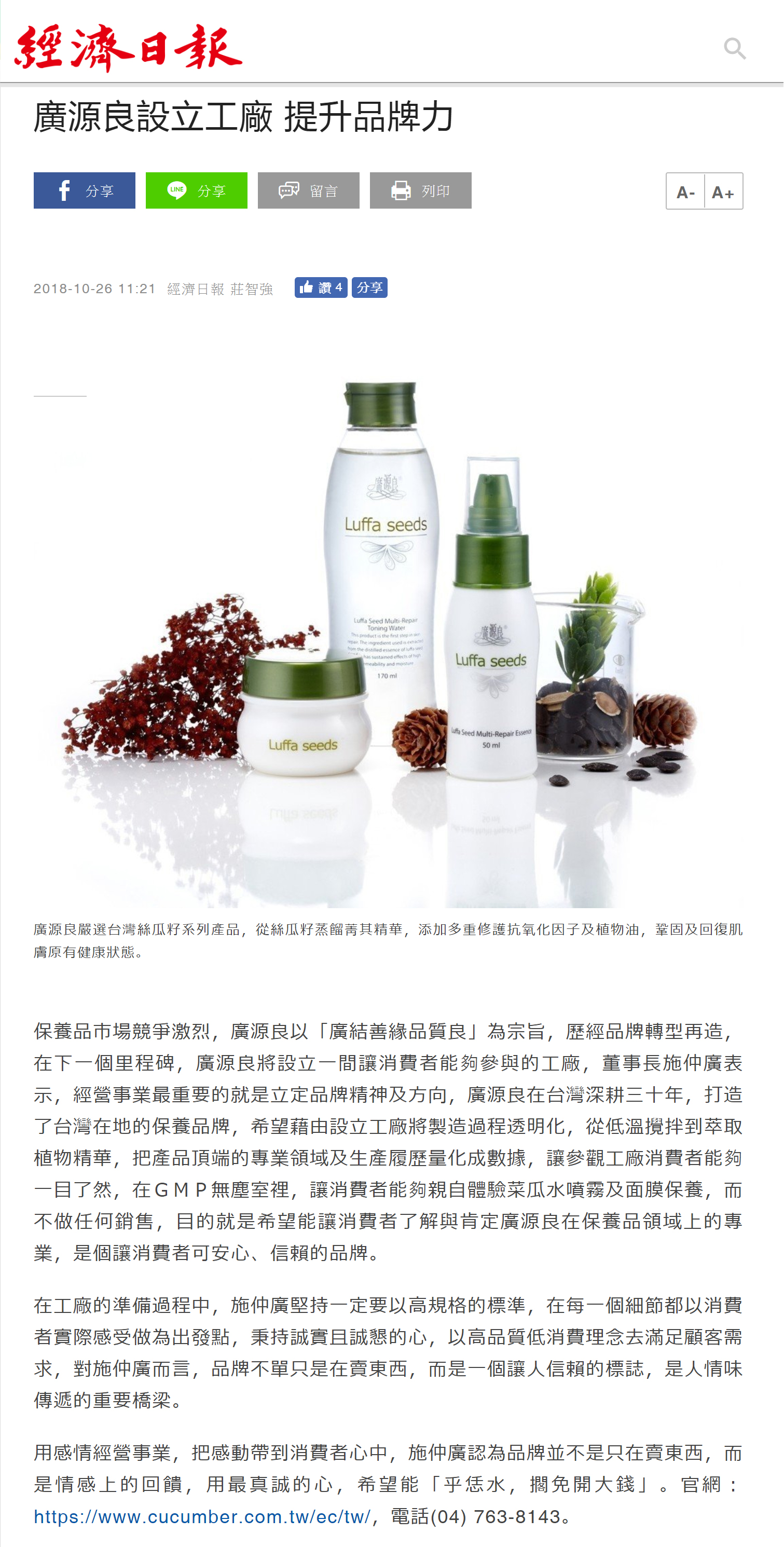 10.26經濟日報刊登主題【廣源良設立工廠 提升品牌力】廣源良以「廣結善緣品質良」為宗旨,歷經品牌轉型再造。在下一個里程碑,廣源良將設立一間讓消費者能夠參與的工廠,希望藉由設立工廠將製造過程透明化,讓參觀工廠消費者能夠一目了然,目的就是希望能讓消費者了解與肯定廣源良在保養品領域上的專業,是個讓消費者可安心、信賴的品牌。