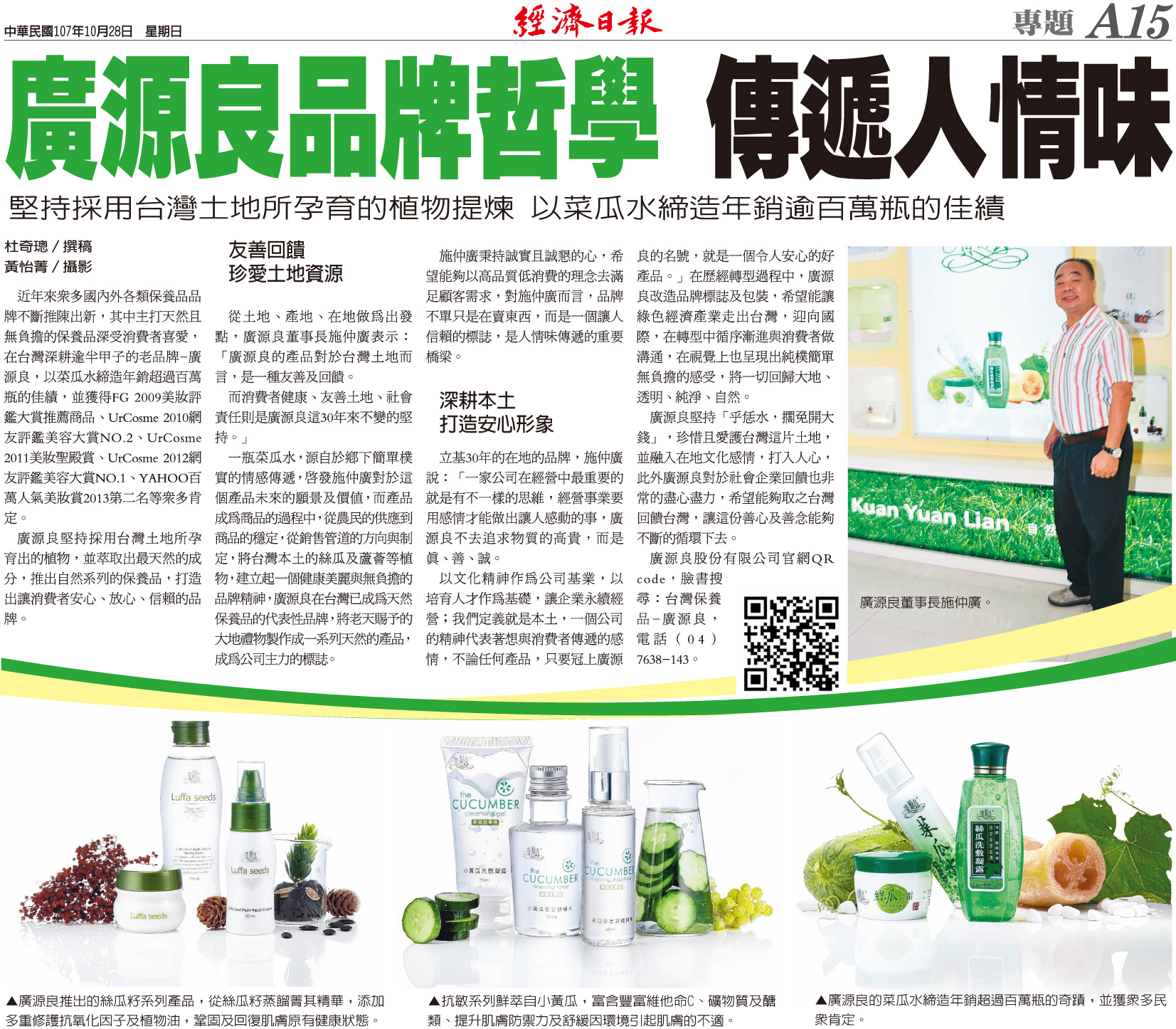 10.28經濟日報刊登主題【廣源良品牌哲學 傳遞人情味】。廣源良堅持採用台灣土地所孕育的植物提煉,以菜瓜水締造年銷逾百萬瓶的佳績,並以「土地、產地、在地」做為出發點—友善土地,珍惜且愛護台灣這片土地,並融入在地文化感情,打入人心。此外,廣源良對於社會企業回饋也相當盡心盡力,希望能取之台灣、回饋台灣,讓這份善心善念能夠不斷循環下去。