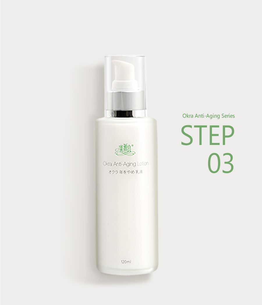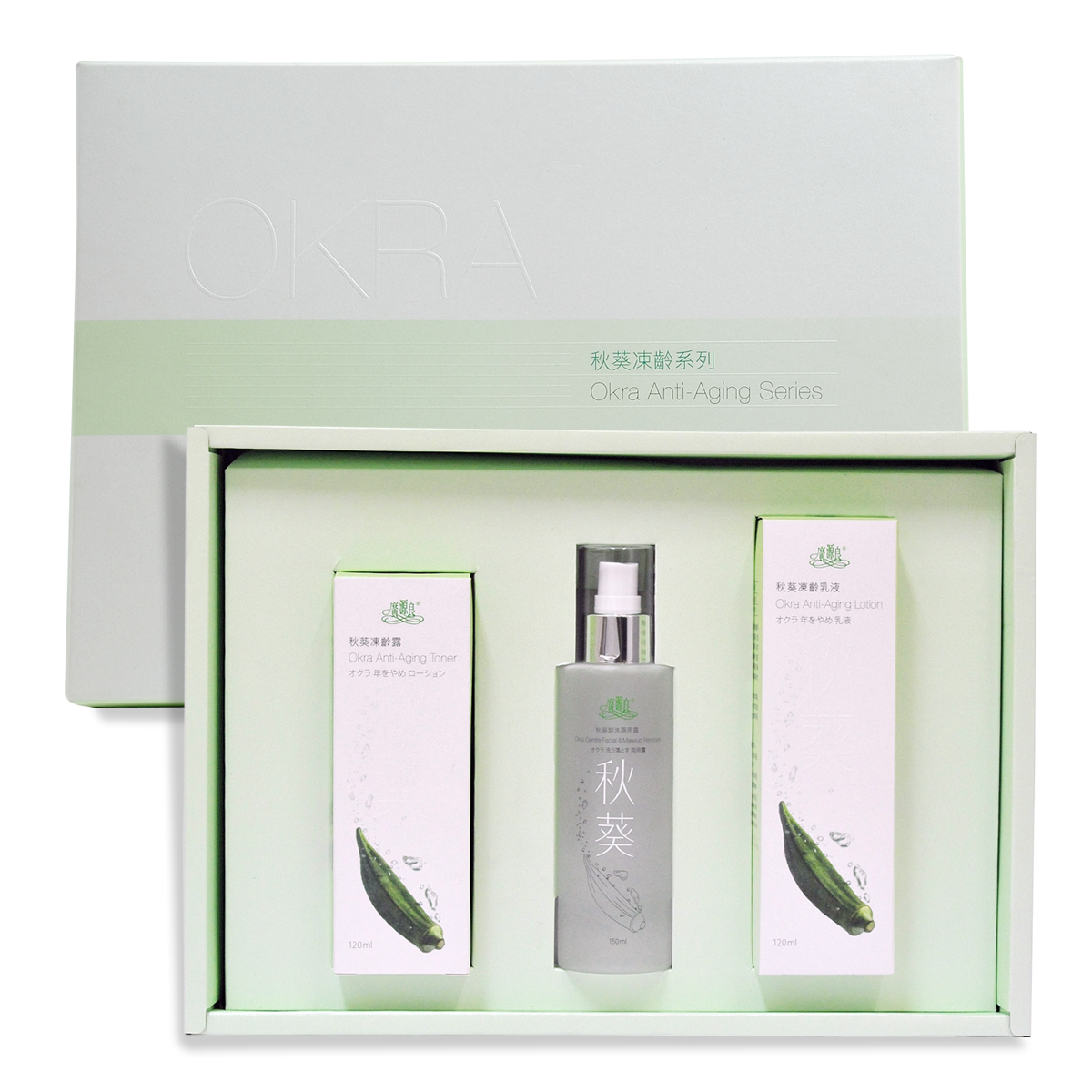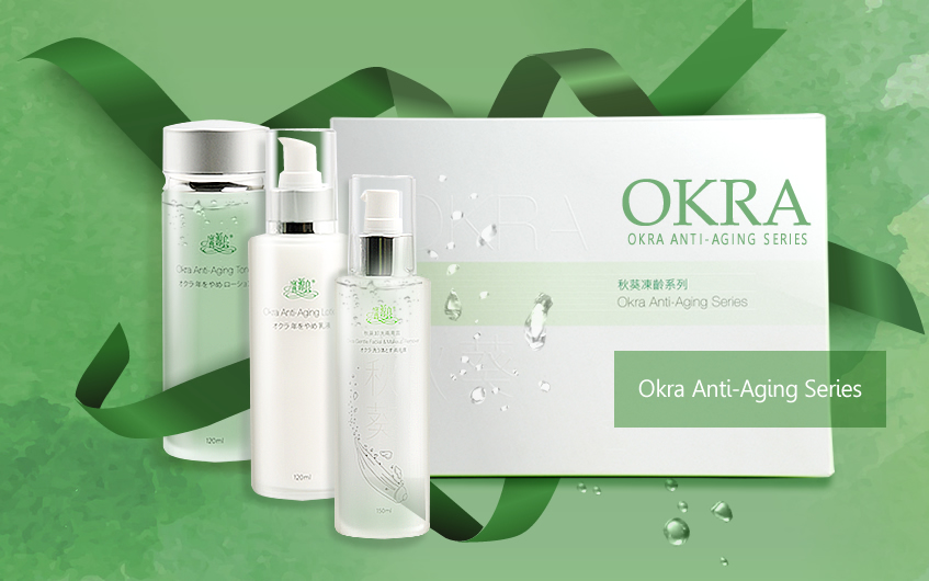 - ●Okra Anti-Aging Lotion: Containing rich polysaccharides and ceramide, the Okra Anti-Aging Lotion deeply moisturize, repair and restore your skin base to increase your skin moistures content and water locking abilities, thereby making your skin both elastic and smooth.