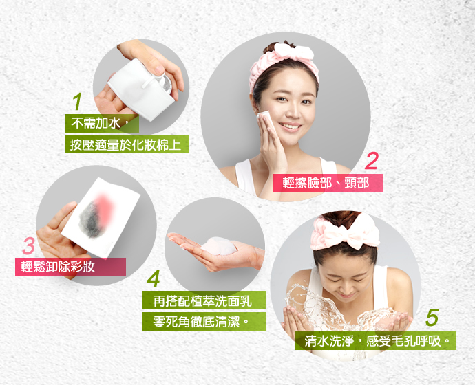 - 輕輕擦拭於全臉肌膚,再以溫水洗淨即可。