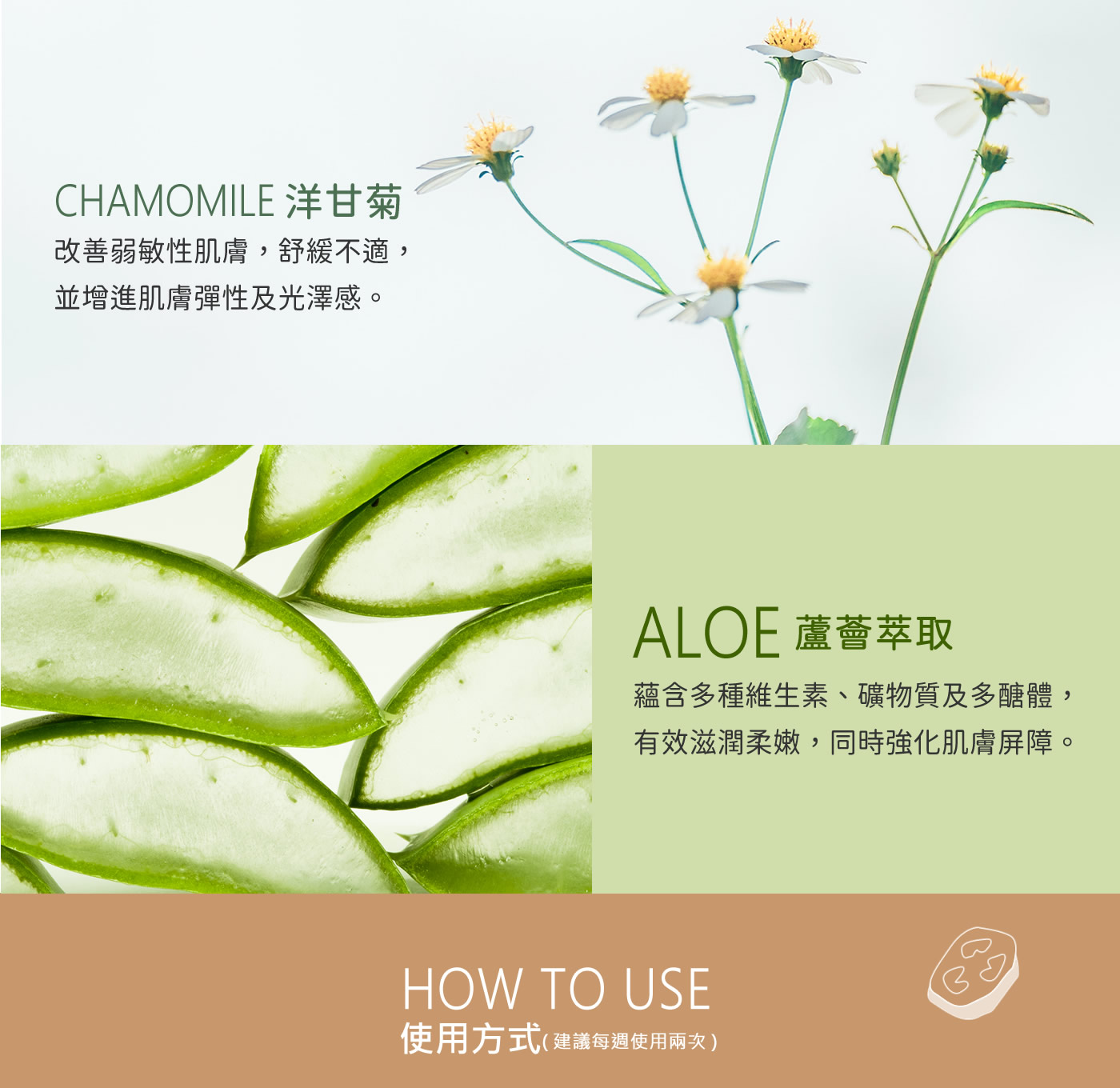 - 取適量均勻塗抹於臉部或身體其他部位肌膚上,涼敷約15-20分鐘後,用清水洗淨即可。