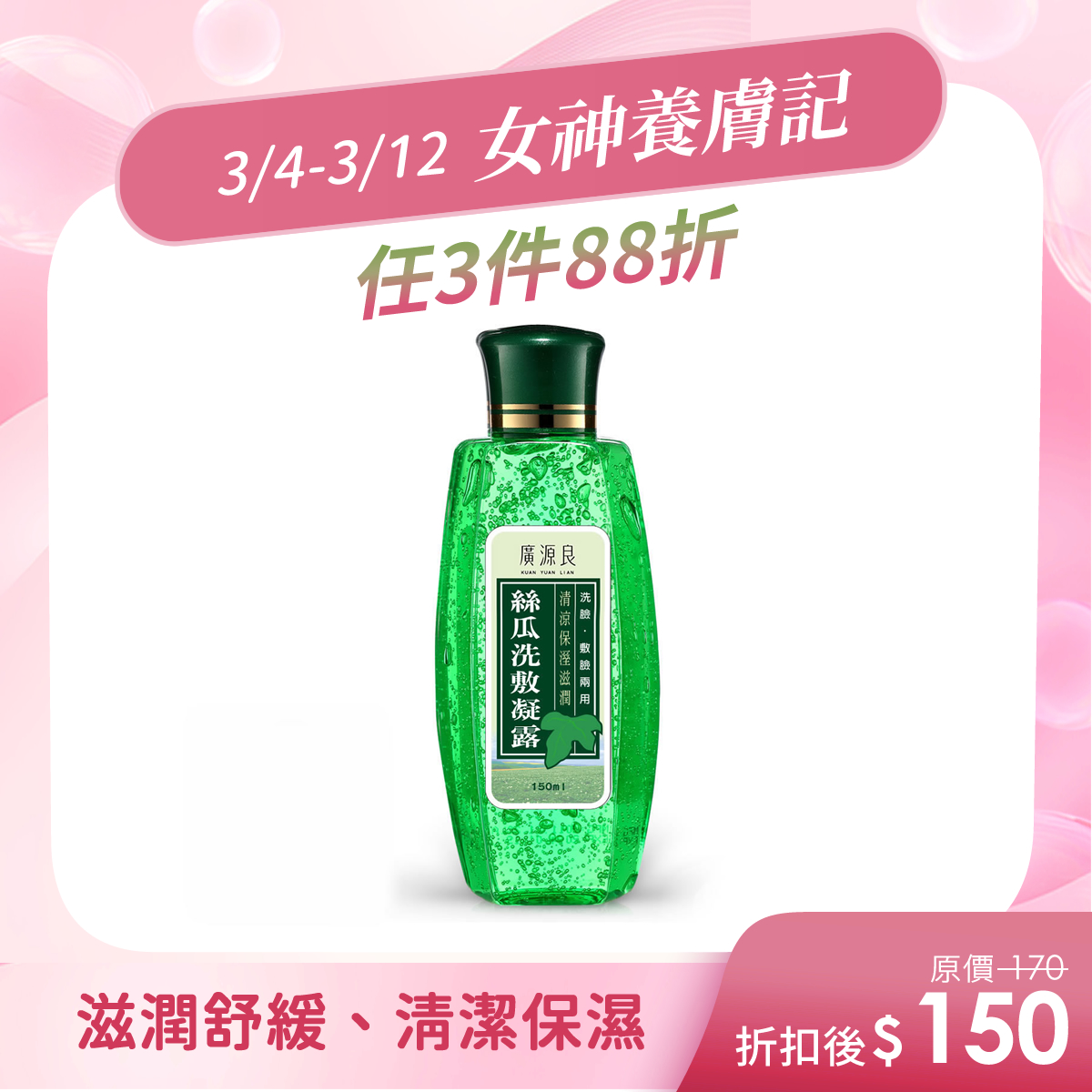 滋潤舒緩、清潔保濕絲瓜洗敷凝露150ml$170滋潤舒緩、清潔保濕
