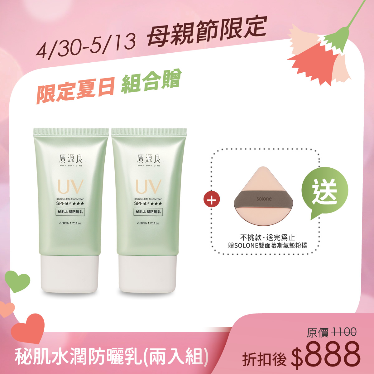夏日必備!物理防曬💚【母親節限定】秘肌水潤防曬乳SPF50+★★★ (兩入組)$800夏日必備!物理防曬💚