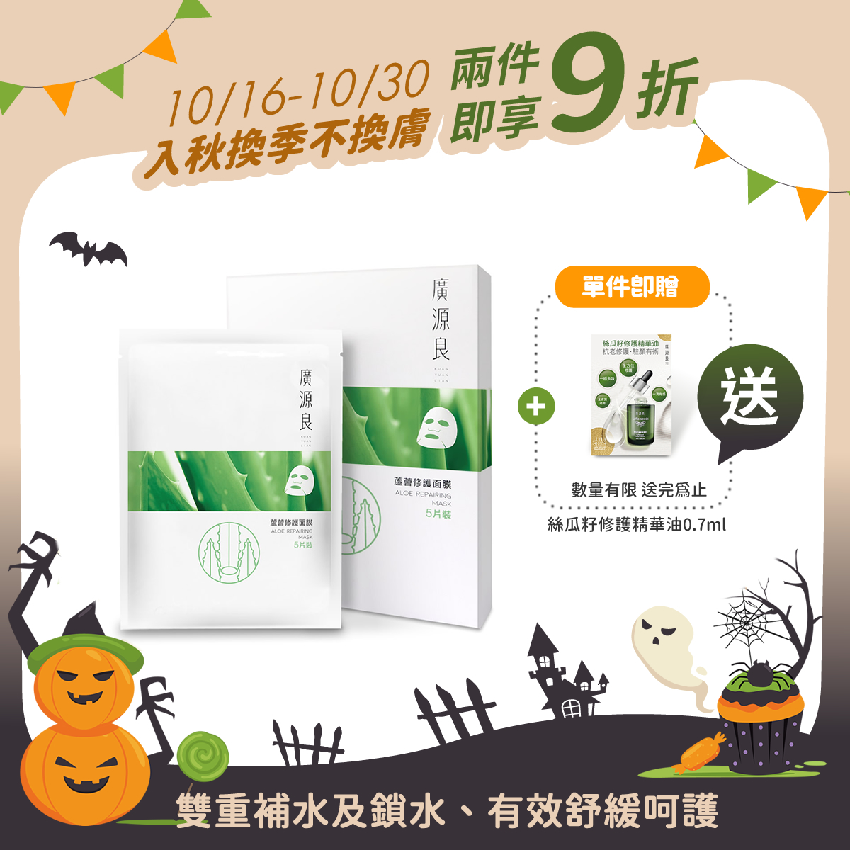 雙重補水及鎖水、有效舒緩呵護蘆薈修護面膜五入$299