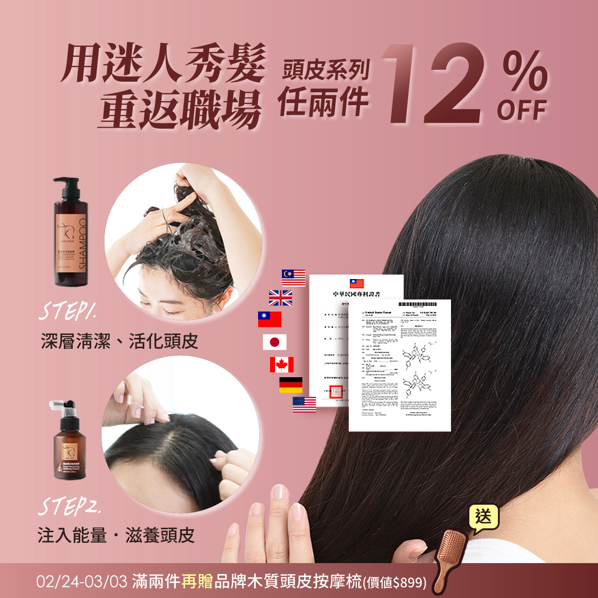 用迷人秀髮重返職場 ✨ 頭皮系列任兩件12%off,兩件再贈品牌木質頭皮按摩梳(價值$899) 💖點擊查看👀